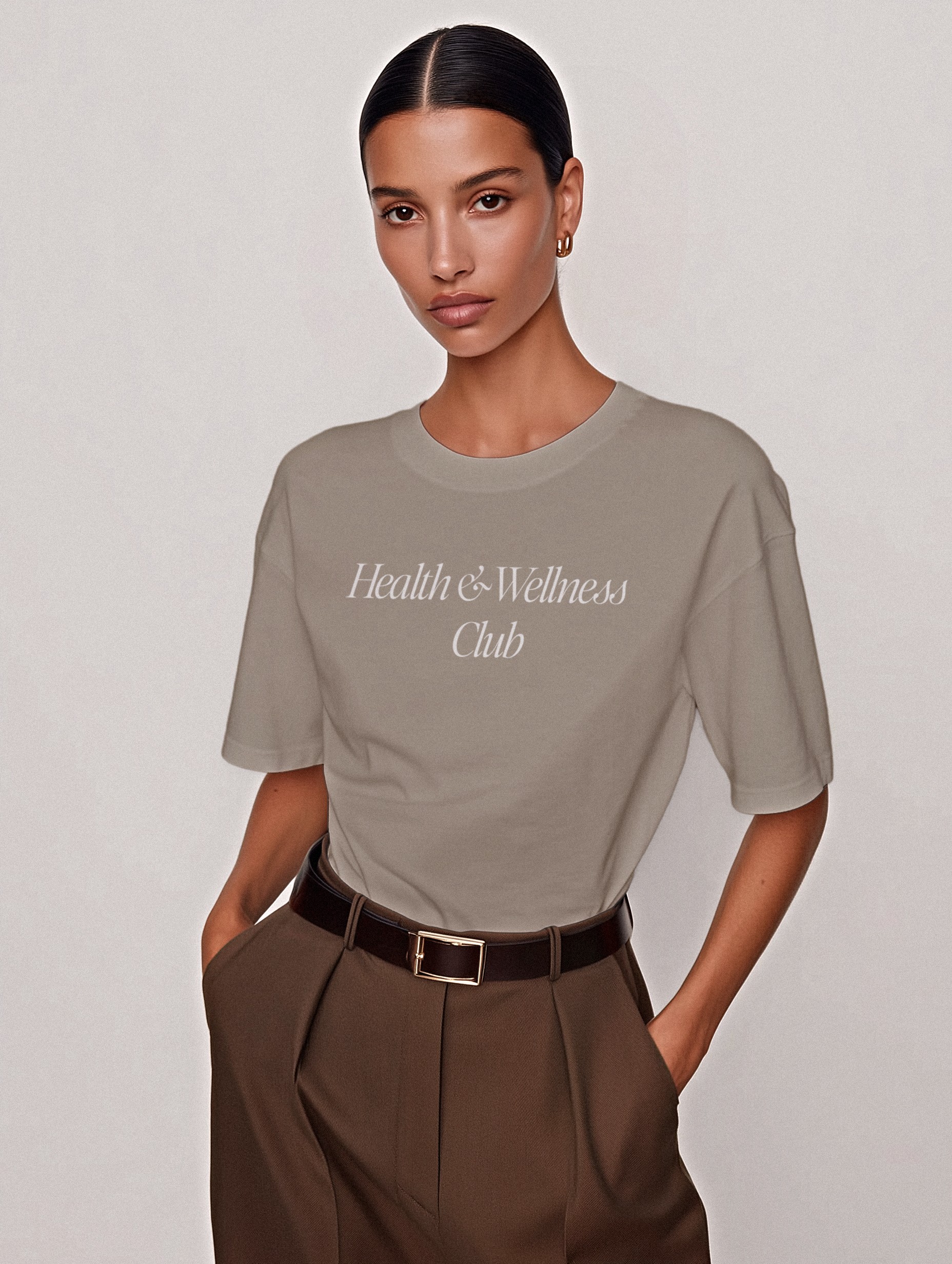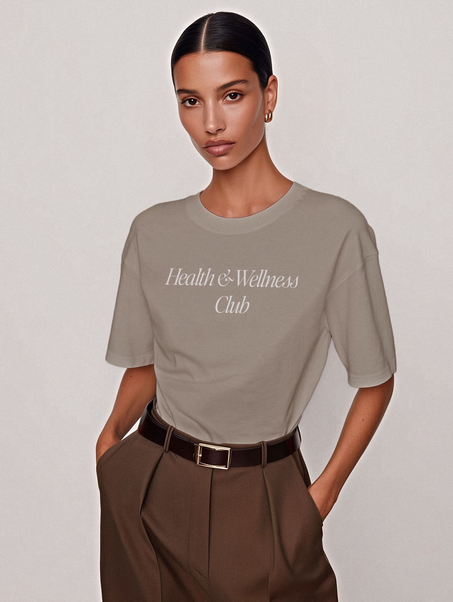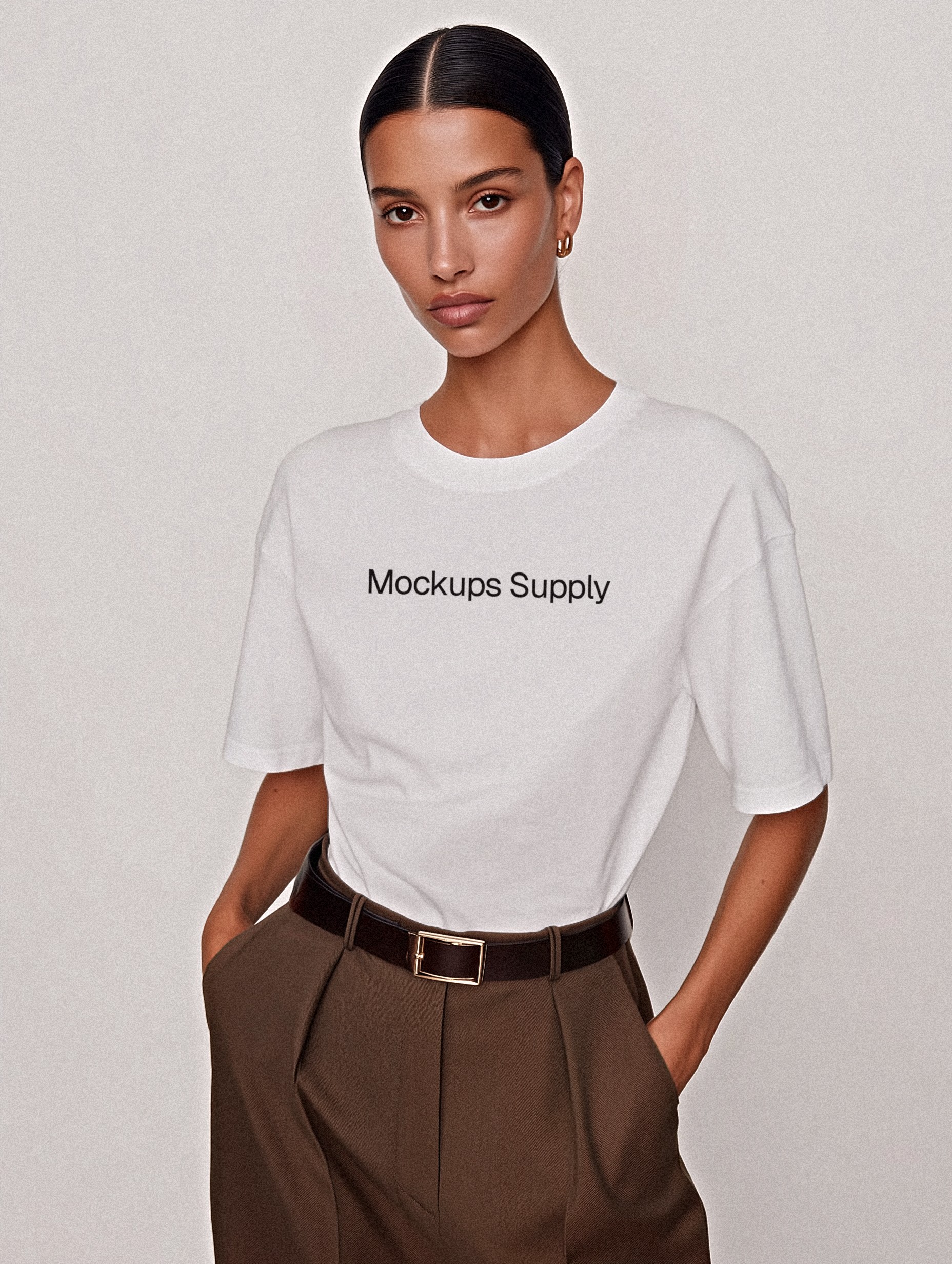 Present your apparel branding with a premium realistic oversized T-shirt mockup on a female model styled in elegant brown pants and gold jewelry. Designed with realistic fabric texture, subtle shadow gradients and smart-object layers, this Photoshop PSD is perfect for fashion brands, merch collections, portfolio presentations, e-commerce listings and social visuals. Apply your design instantly for polished, commercial-ready apparel imagery.